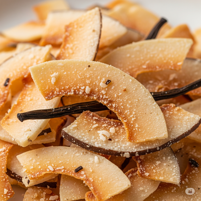 Lightly roasted coconut chips infused with smooth vanilla flavor - a subtly sweet and satisfying snack.